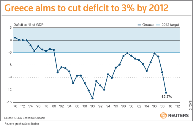 Ik zocht een grafiekje van de economische prestaties van de Griekse overheid over de laatste jaren, bijvoorbeeld in de vorm van jaarlijks budgettekort. Daarvan onderstaand een plaatje. Ter vergelijking wilde ik natuurlijk Nederland even zien, en daarbij kwam ik op een alleraardigst artikel in the Economist, Democracy and deficits, waar de schrijver het daadwerkelijk presenteren van concrete begrotingen in Nederland stelt tegenover vaag geklets in de Verenigde Staten. Ik werd weer even trots op ons, hoor.